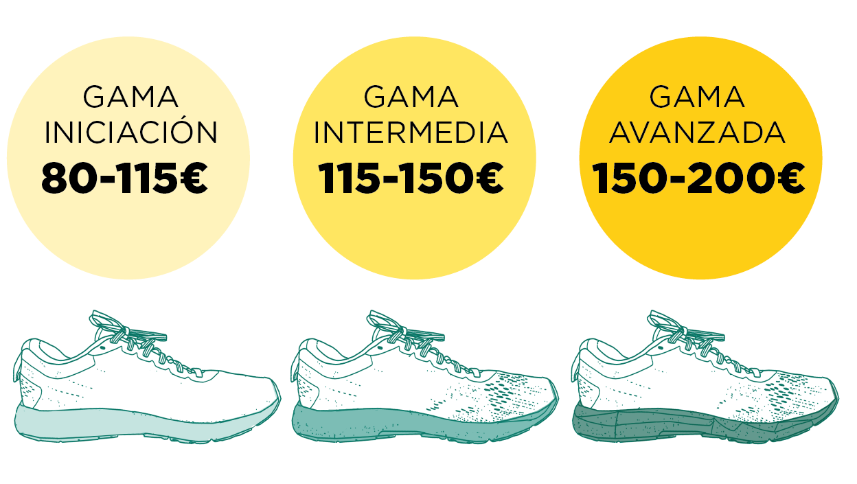 El precio de las zapatillas depende de la calidad de la amortiguación y de que el material sea más flexible. Hay tres gamas, que van desde los 80 euros de iniciación a los 200 de la gama superior.