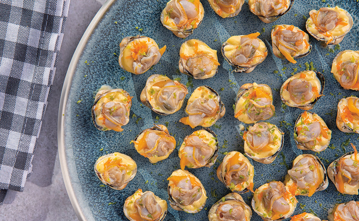Añade en hilo fino el AOVE hasta obtener la salsa ligada. Añade el jugo de cocción de los berberechos frío hasta lograr una salsa ligera y fluida, cremosa. Rectifica de sal. Rellena cada concha con una fina capa de mahonesa. Extiende el picadillo aliñado de zanahoria y apoya encima el berberecho. Ralla al final un poco más de lima.