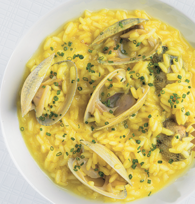 Esparce el cebollino. Que el risotto nunca quede amazacotado, sino ligado, cremoso, con el grano íntegro y con brillo. Ojo con salar mucho antes de añadir las almejas, el jugo que sueltan es potente y muy salino.