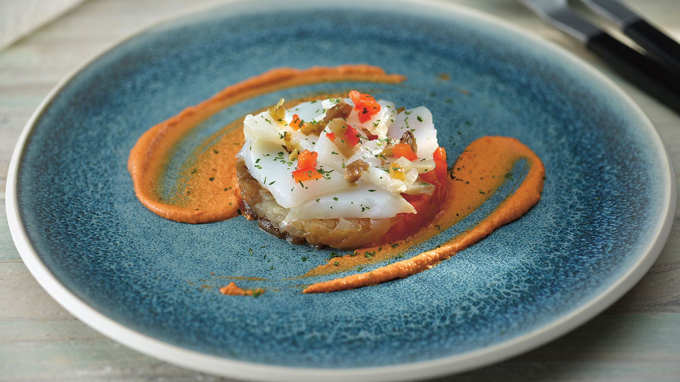 Una receta de Martín Berasategui para hacer un delicioso plato de ensalada de bacalao y escalibada. Foto: José Luis López de Zubiría / Ilustraciones Javirroyo