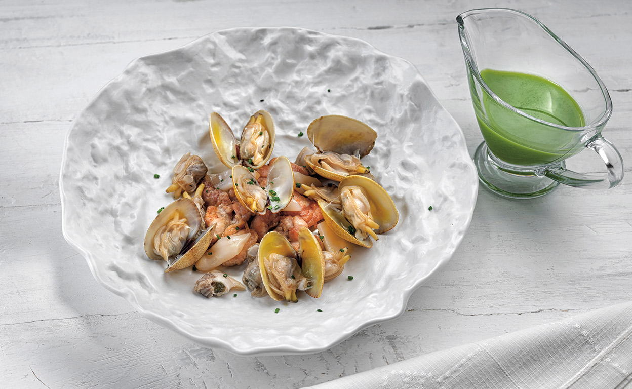 Acabado: Al servir el plato, escurre las mollejas, sálalas un poco y saltéalas en una sartén bien caliente con una pizca de aceite de oliva, tostándolas 1 minuto por cada lado. A mitad de cocción añade una cucharada de mantequilla clarificada para hacerlas aún más apetecibles y pimiéntalas. Colócalas en un plato, pásale a la sartén un papel y abre las navajas con un hilo de aceite de oliva, rápidamente. Haz lo mismo con las almejas, abriéndolas sin que se sequen.