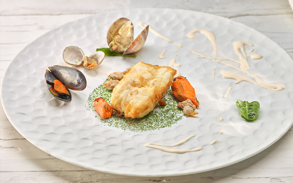 Una vez dorados los lomos, se escurren a un plato con papel absorbente. En un plato se dispone la merluza, se reparten unas almejas, unos berberechos y unos mejillones alrededor y se acompañan con unas hojas y brotes de espinaca frescos y aliñados con sal y pimienta. Se riega con la mayonesa de moluscos y se espolvorea con el polvo de perejil.