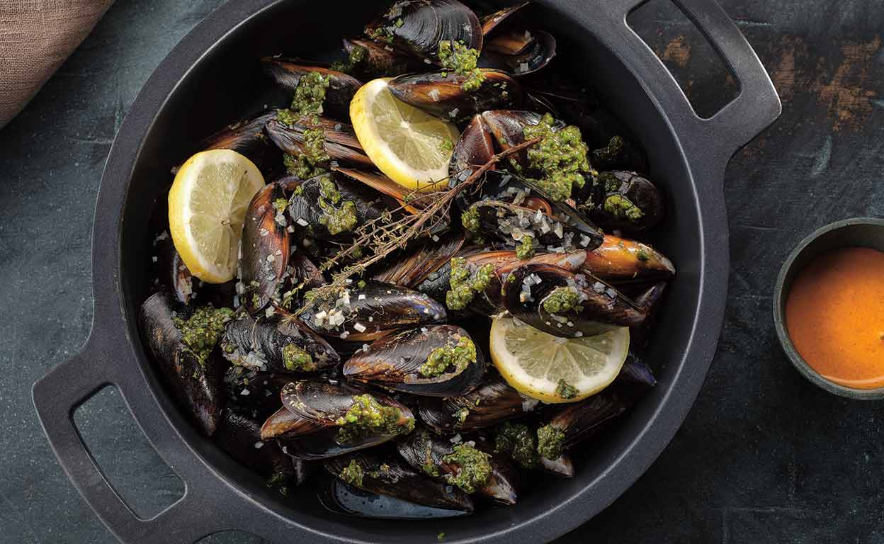 De la salsa: pica las hierbas sobre la tabla o con unas tijeras. Mezcla todos los ingredientes con el jugo de la cocción de los mejillones para obtener un aderezo muy sabroso.