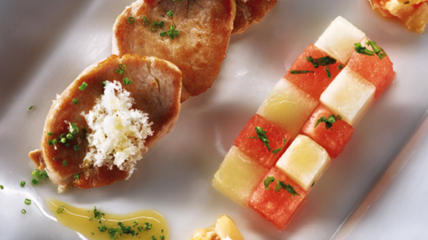 Una receta de Martín Berasategui de solomillo de cerdo a la sandía y melón con miel y nueces.