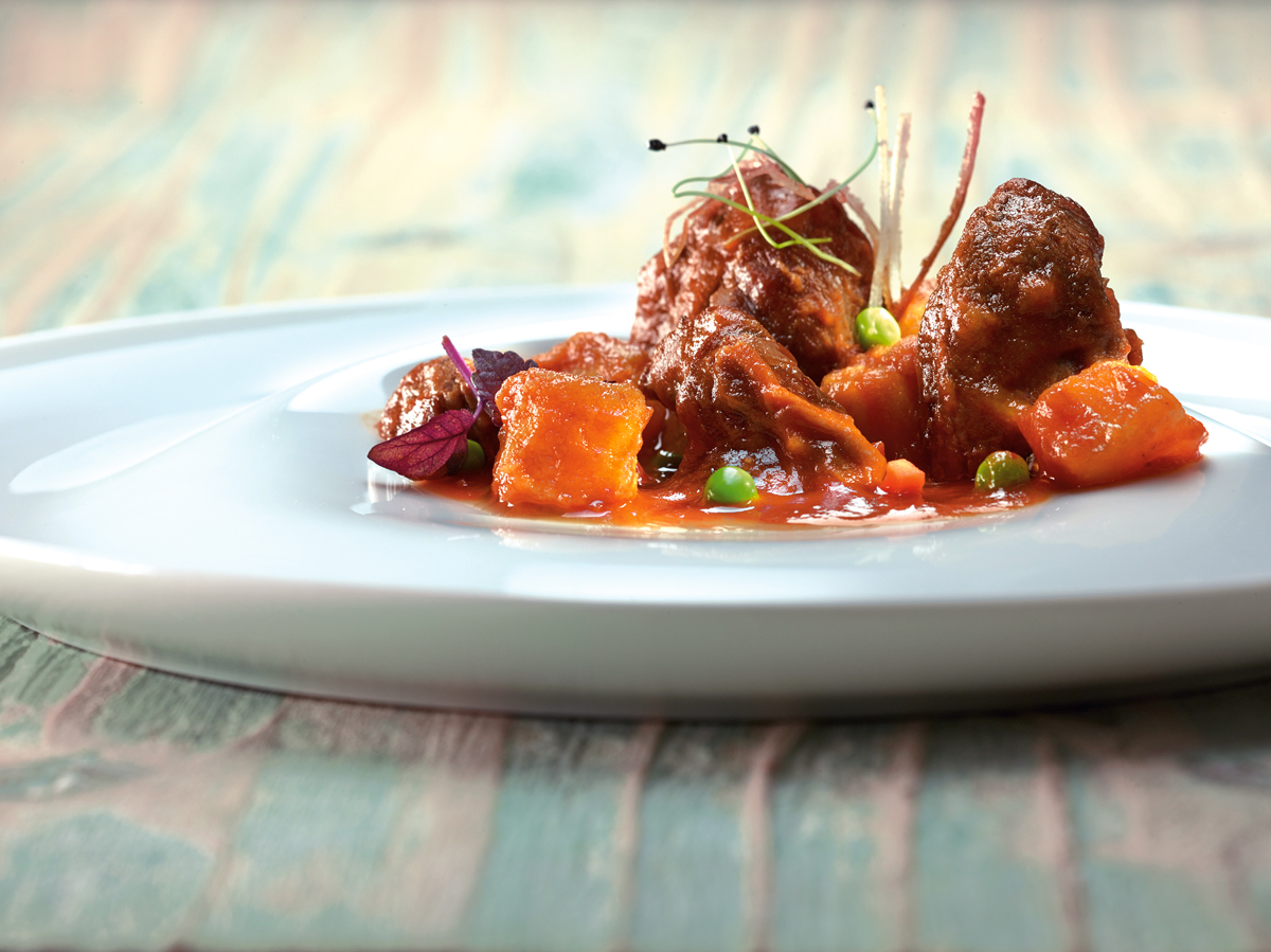 1. Se corta la carne en trozos de 4 x 3 cm, se sala y fríe en una cazuela a fuego fuerte con 125 g de aceite. Se reserva. En la misma cazuela, con el resto del aceite, se pocha la verdura durante media hora.