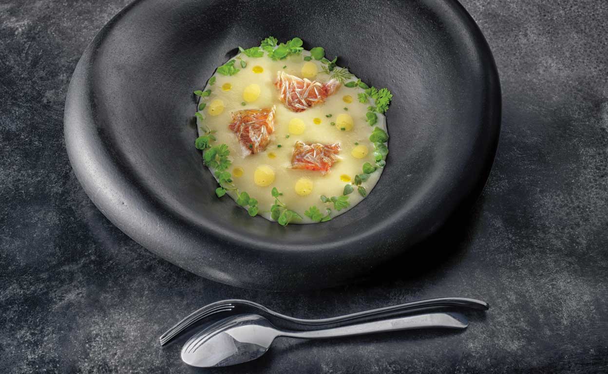 Repite la operación un par de veces. Sirve los lomos con escamas comestibles sobre la vichyssoise bien fría. Esparce algunas hierbas aromáticas y riega con un hilo muy fino del jugo reducido de azafrán y unas gotas de AOVE.