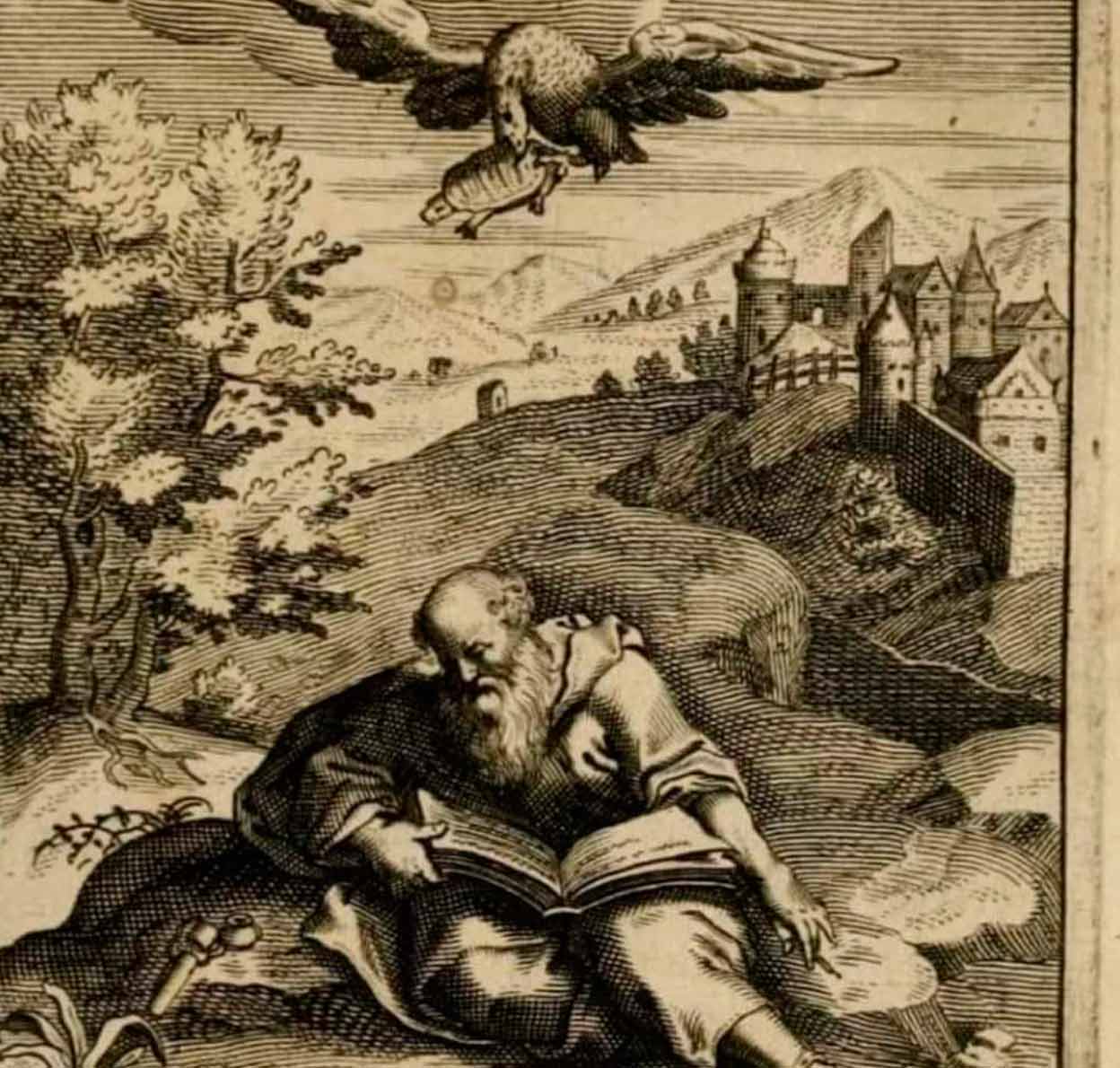 Esquilo se fue al campo, pero la maldición se fue con él: murió aplastado por una tortuga que le cayó del cielo, se le desprendió de las garras a un quebrantahuesos. Qué improbable es que lluevan tortugas, pero, ay, a veces sucede lo improbable.