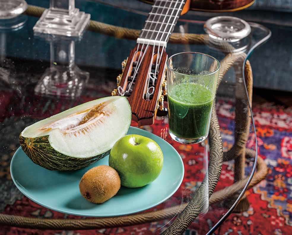 «Un zumo verde con apio, espinacas, pera, melón… (nunca pepino: no todo se puede fusionar). Una tostada con aceite y jamón york. Café con leche y galletitas».