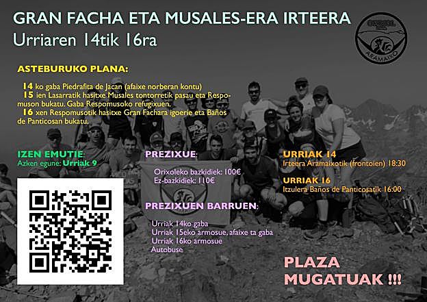 Pirinioetako bi menditara igotzeko irteera antolatu dute Aramaion. Horrela, Gran Facha eta Musales-era igoko dira urriaren 14tik 16ra, Orixol Mendi Elkarteak prestatuta. Abiapuntua Aramaioko frontoia izango da, urriaren 14an, 18.30ean. Buelta, berriz, Baños de Panticosatik izango da, 16.00etan.